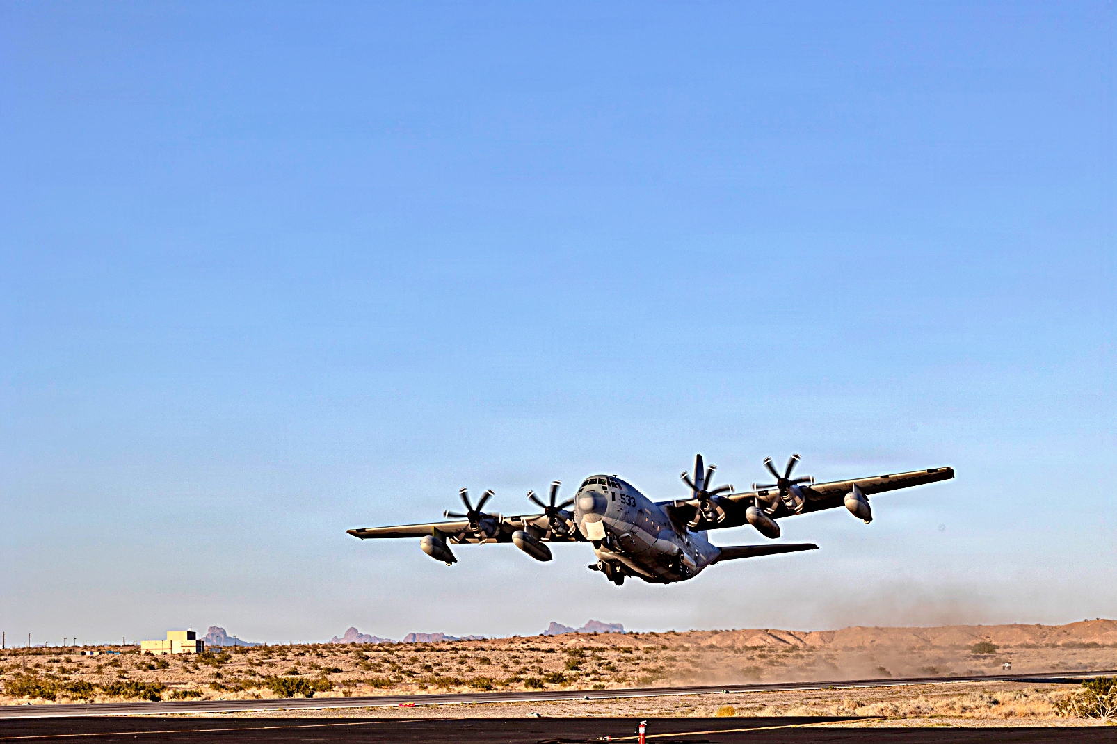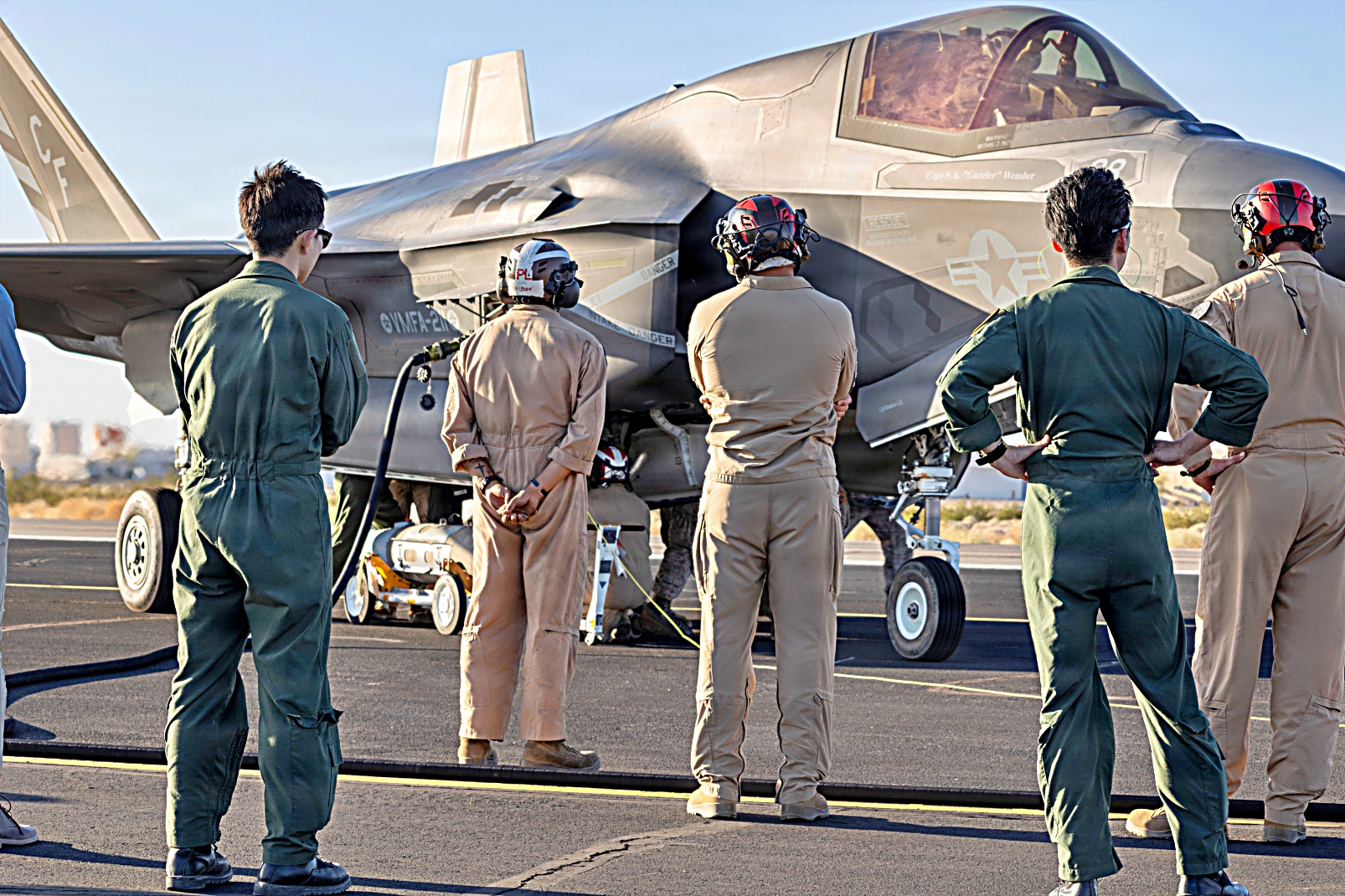 2026년 4월 1일, 애리조나주 유마 해병항공기지에서 해병항공무기전술비행대대 1(MAWTS-1) 소속 미 해병대원들이 무기전술교관 과정 2-26 (WTI 2-26 : Weapons and Tactics Instructor course 2-26)의 일환으로 F-35B Lightning II 공격기가 KC-130J 허큘리스 수송기가 운반해온 무장을 장착하고 재급유를 받은 후 단거리 이착륙(STOVL) 훈련을 실시하고 있다.