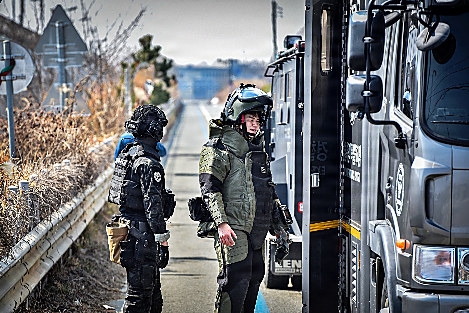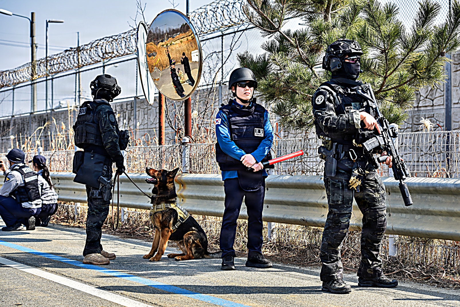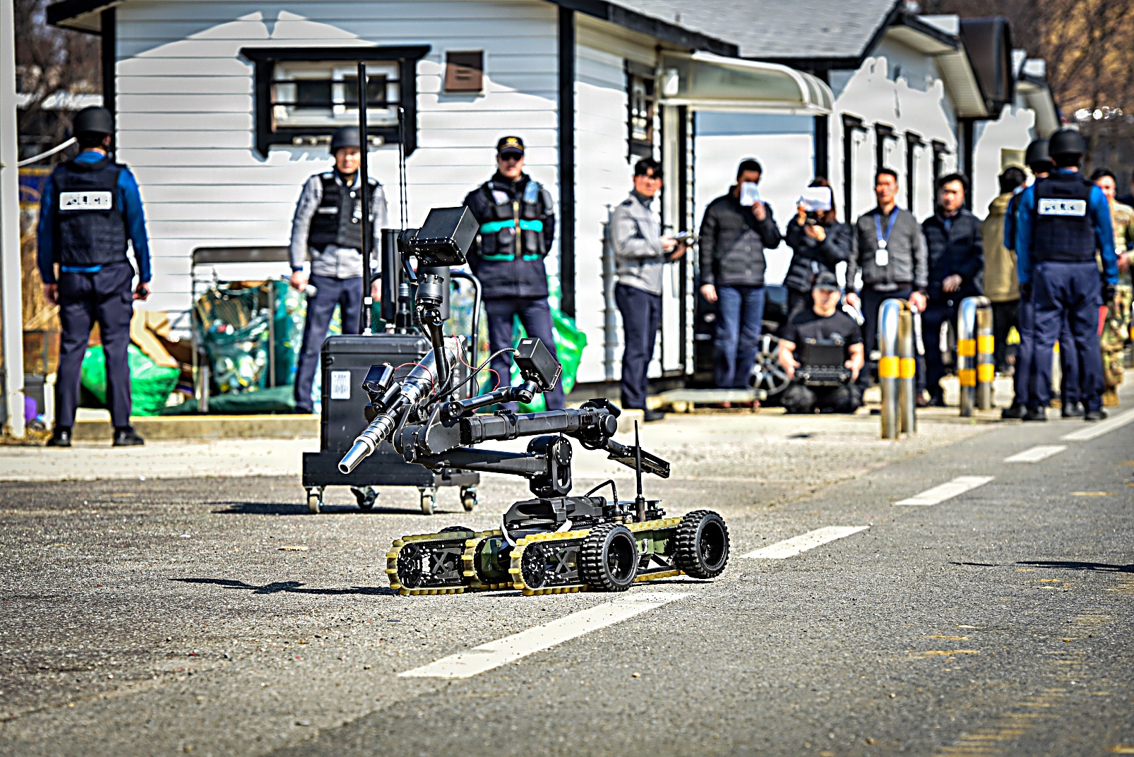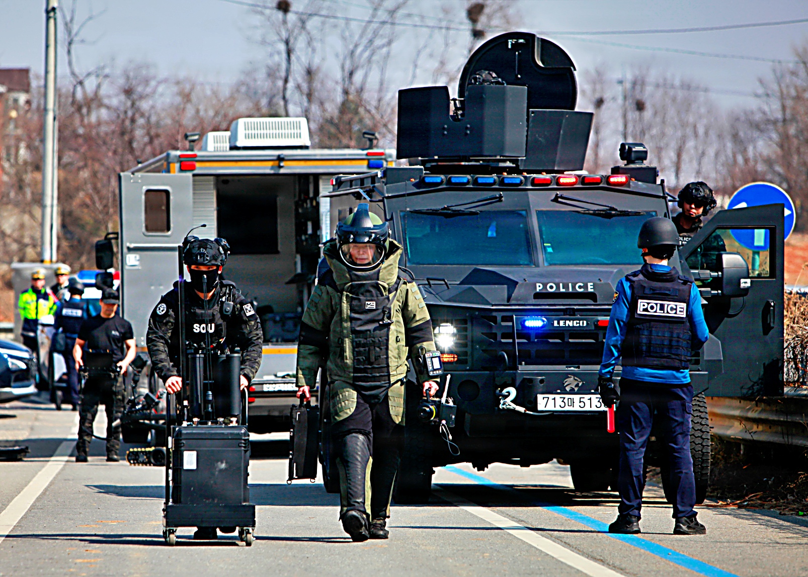 2026년 3월 17일, 대한민국 평택에서 한국 경찰청 특수기동대(SWAT) 팀이 미 육군 험프리스 기지 소속 요원들과 합동 훈련 시나리오의 일환으로 의심스러운 소포를 통제 폭파하고 있다. 이번 훈련은 폭발물 위험을 안전하게 제거하고 시민 안전을 확보하기 위해 한미 합동 인원들이 현장을 확보하고 폭발물 처리 EOD : Explosive Ordnance Disposal) 절차에 따라 폭파 작업을 진행했다.