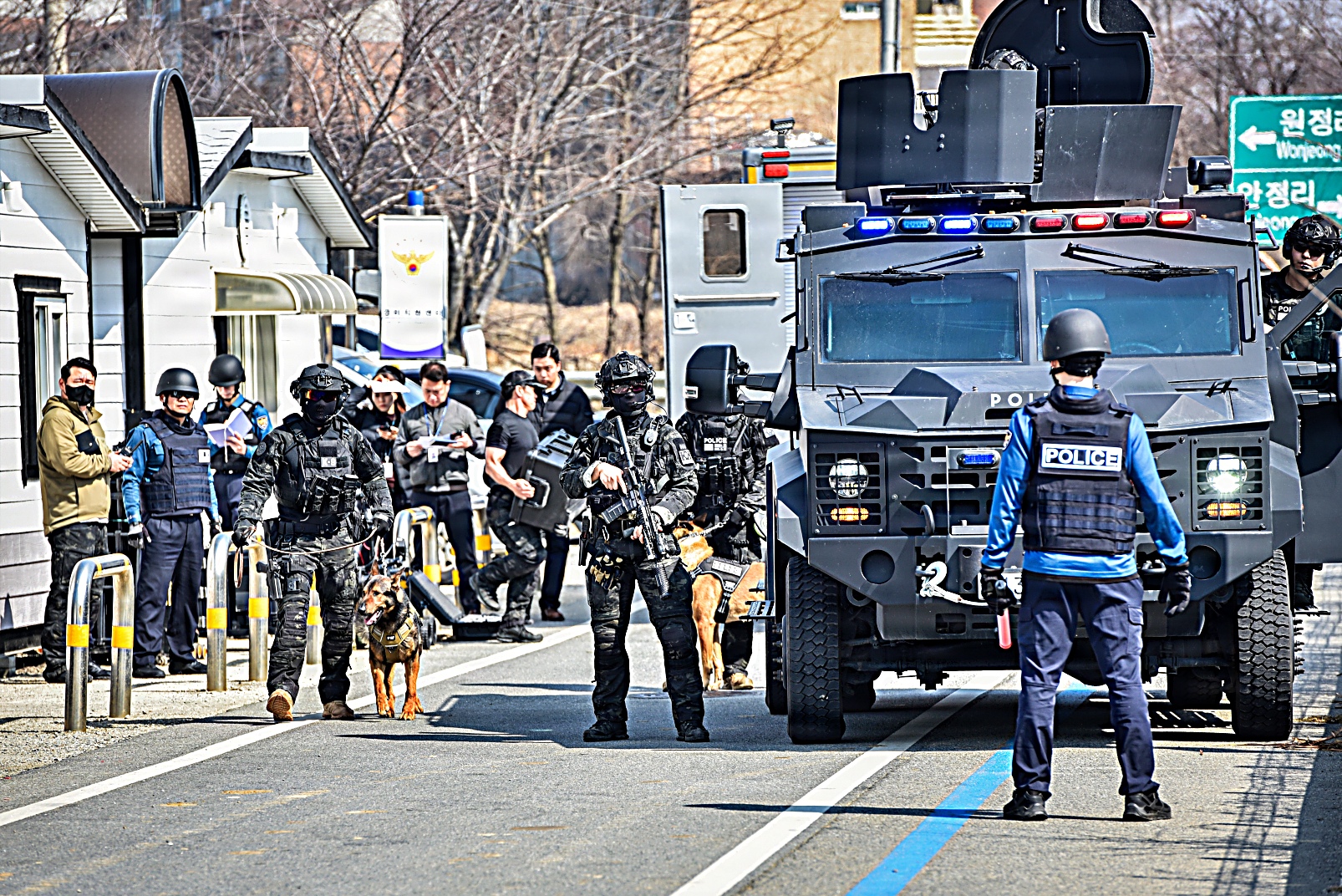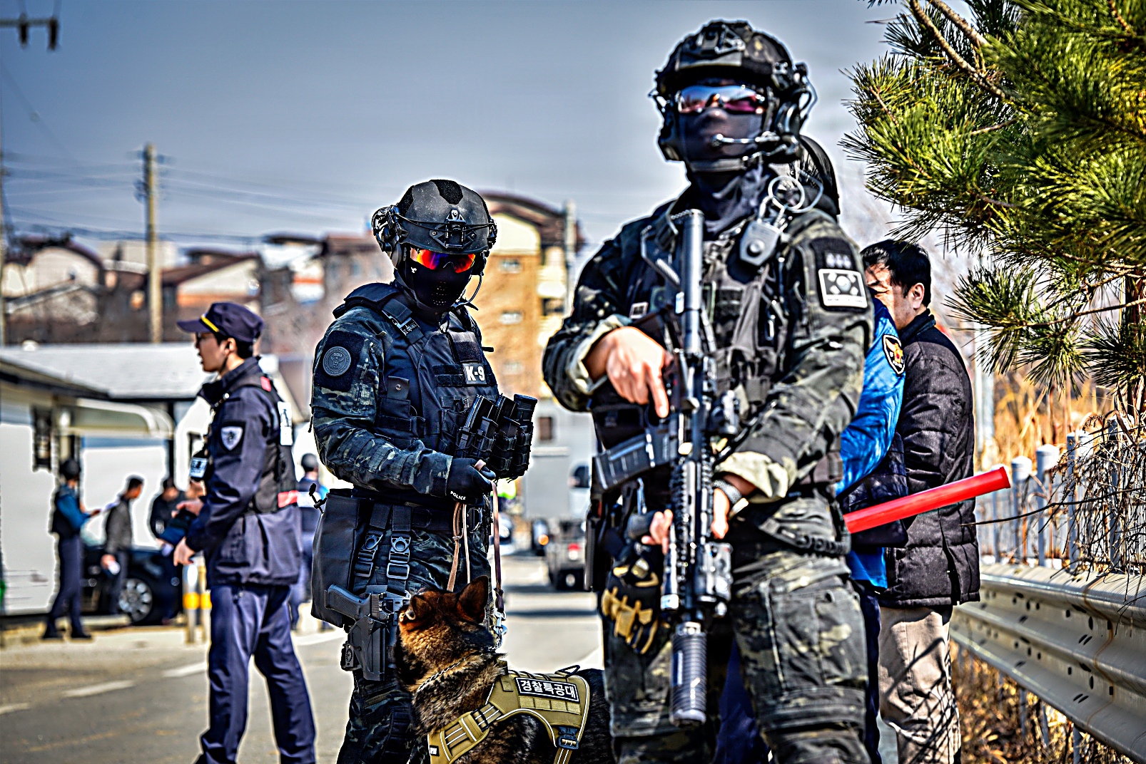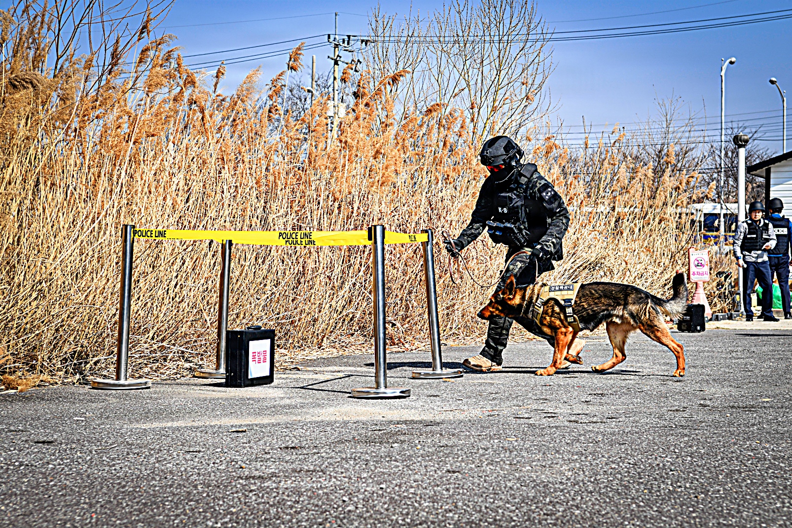 2026년 3월 17일, 대한민국 평택에서 한국 경찰청 특수기동대(SWAT) 팀이 미 육군 험프리스 기지 소속 요원들과 합동 훈련 시나리오의 일환으로 의심스러운 소포를 통제 폭파하고 있다. 이번 훈련은 폭발물 위험을 안전하게 제거하고 시민 안전을 확보하기 위해 한미 합동 인원들이 현장을 확보하고 폭발물 처리 EOD : Explosive Ordnance Disposal) 절차에 따라 폭파 작업을 진행했다.