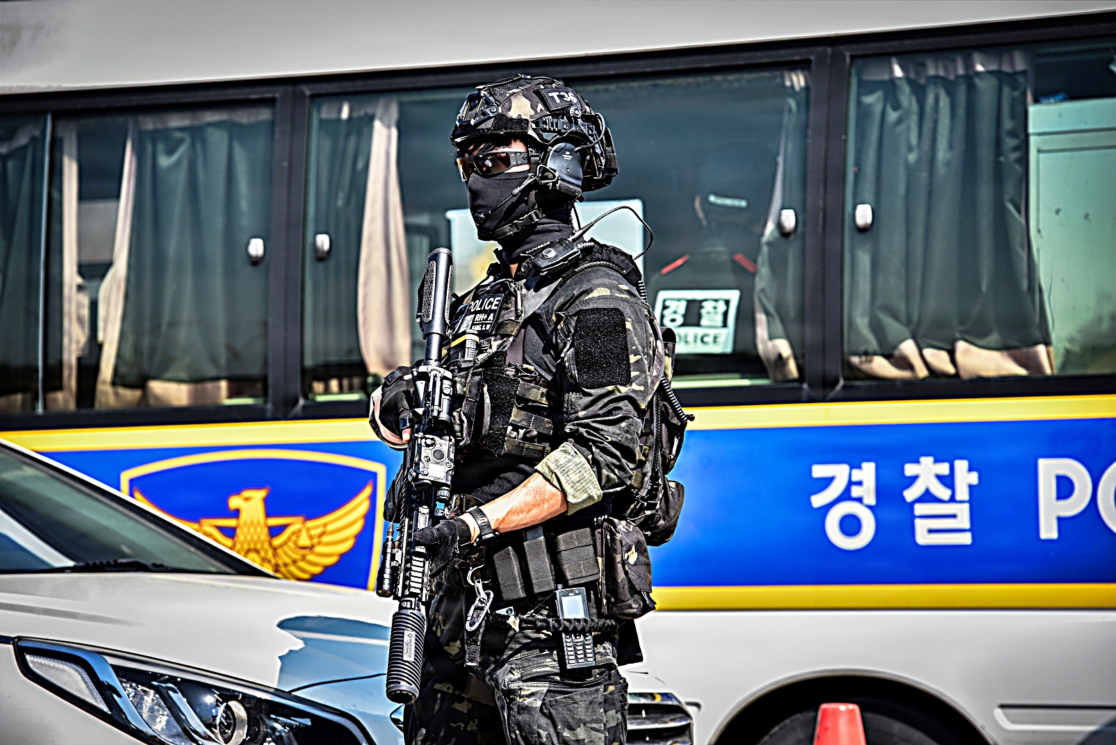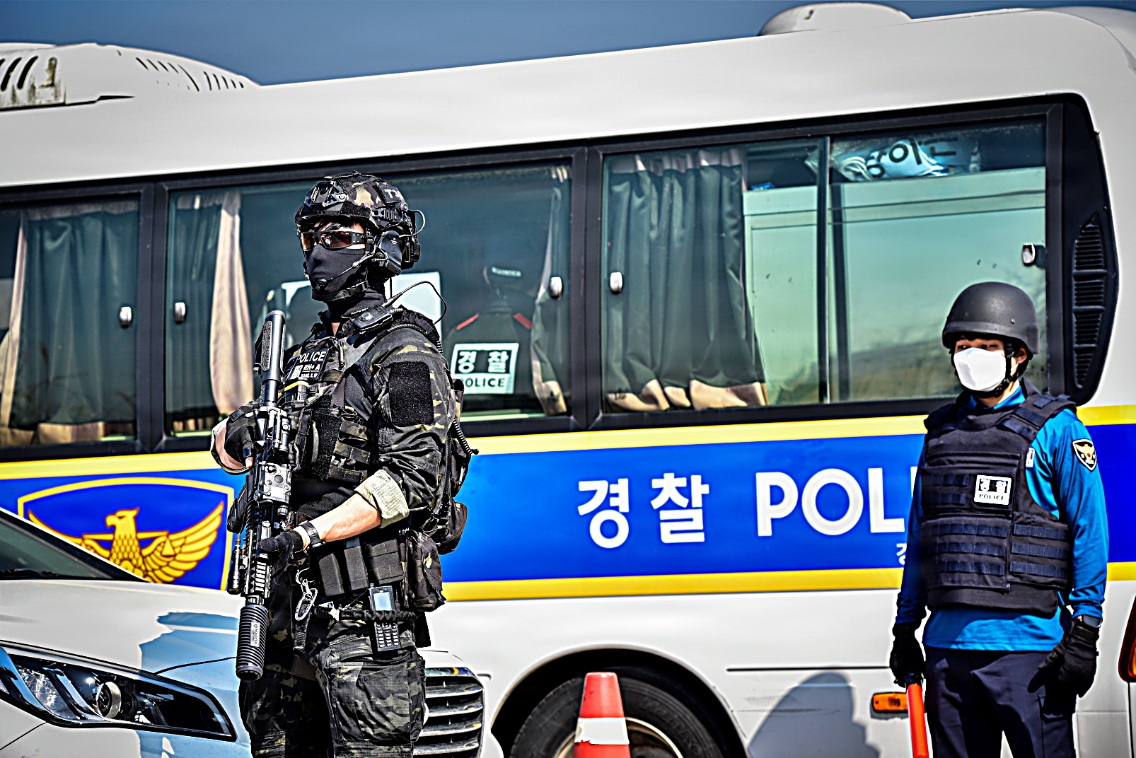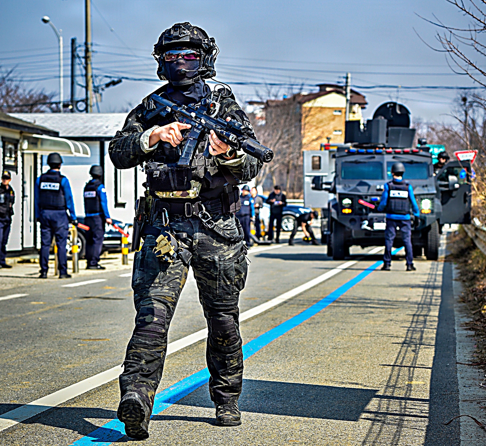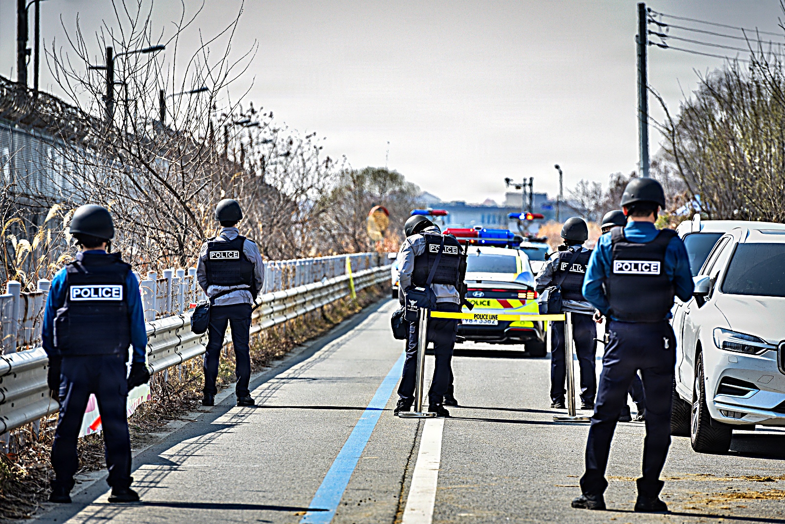 2026년 3월 17일, 대한민국 평택에서 한국 경찰청 특수기동대(SWAT) 팀이 미 육군 험프리스 기지 소속 요원들과 합동 훈련 시나리오의 일환으로 의심스러운 소포를 통제 폭파하고 있다. 이번 훈련은 폭발물 위험을 안전하게 제거하고 시민 안전을 확보하기 위해 한미 합동 인원들이 현장을 확보하고 폭발물 처리 EOD : Explosive Ordnance Disposal) 절차에 따라 폭파 작업을 진행했다.