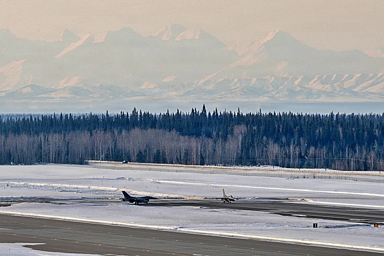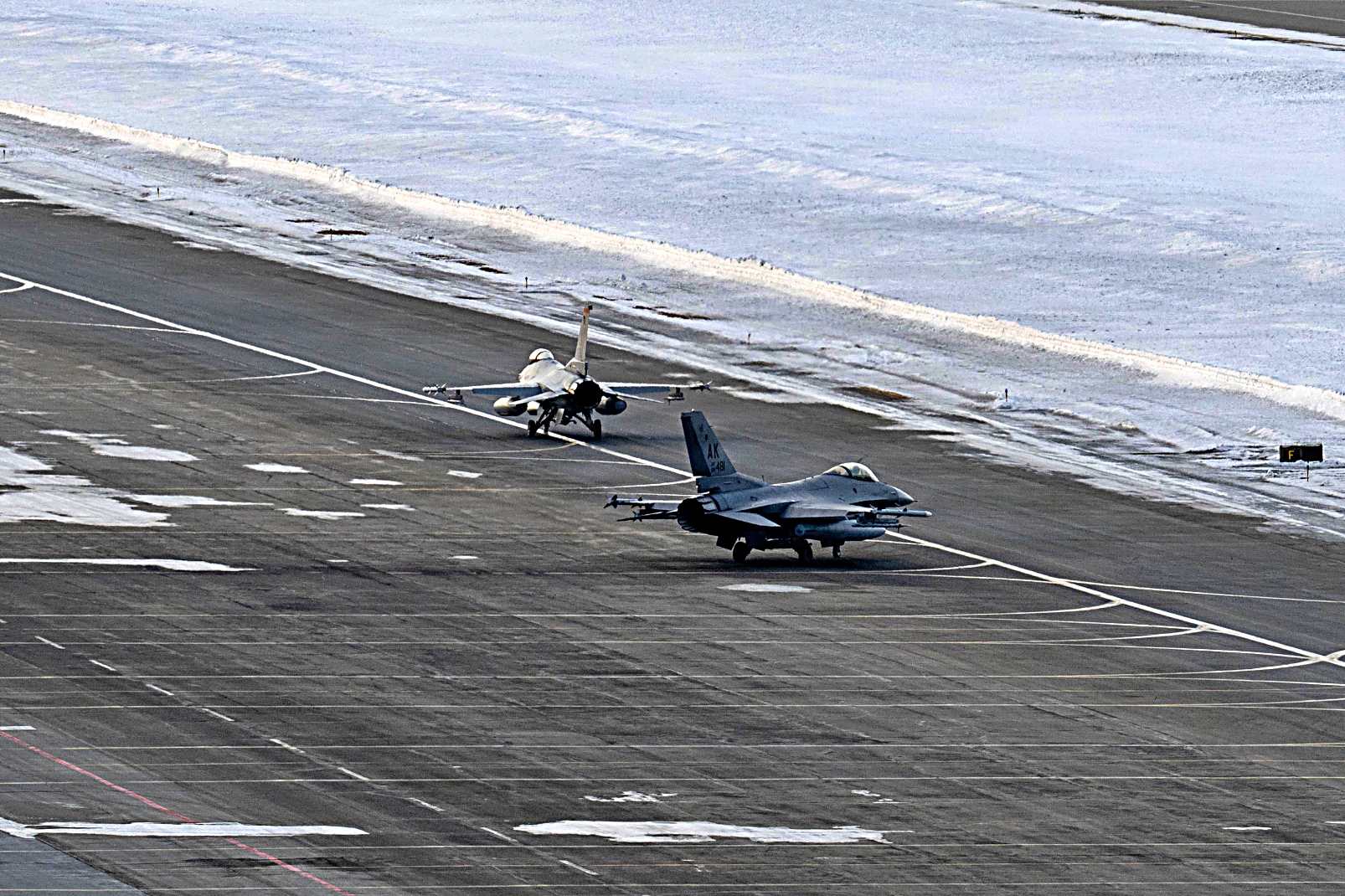 2026년 4월 2일, 알래스카 Eielson 공군기지에서 NORAD에 배속된 제18 전투 요격 비행대 소속 NORAD F-16 Fighting Falcon 이 NORAD 공항으로 향하며 이륙한 후 KC-135 Stratotanker로부터 공중급유를 받으며 초계 비행을 수행하고 있다.