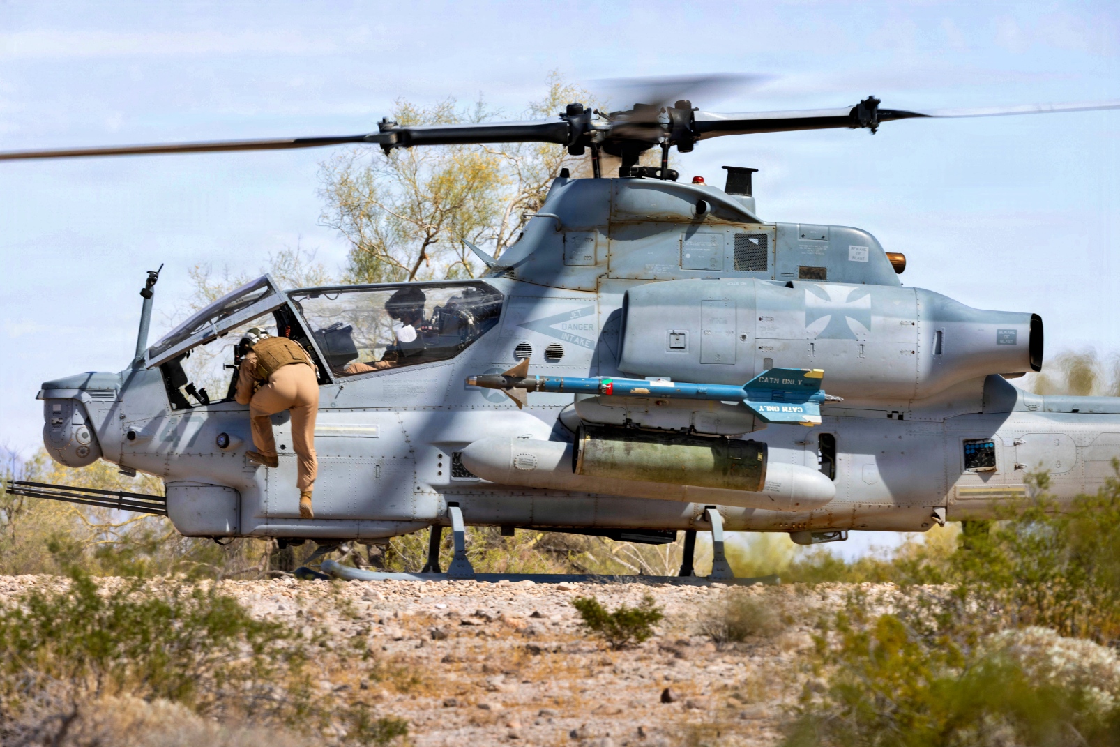 미 해병대 항공무기전술비행대대 1(MAWTS-1 : Marine Aviation Weapons and Tactics Squadron One) 소속 AH-1Z Viper 헬기 조종사들이 2026년 4월 4일 애리조나주 유마 인근 Combat Village에서 진행된 Weapons and Tactics Instructor course 2-26 의 일환으로 모의 인원 구조 훈련 및 근접항공지원 훈련을 실시했다.